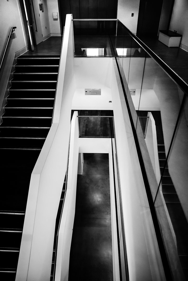 The main stairwell at Studio 144 which is a recently-opened art complex in the centre of Southampton, England The space features a number of new galleries, workshops and video studios. The intention is that it be used for more contemporary art and installations to compliment the existing art gallery in the main civic building nearby. It is a joint venture between Southampton University and the city council. Taken using a Leica M240 with 24mm Elmarit f2.8 at 1250iso. 1/90 f4. This image was converted to black and white using LR Classic for submission to a black and white project on the National Geographic website. Gerry