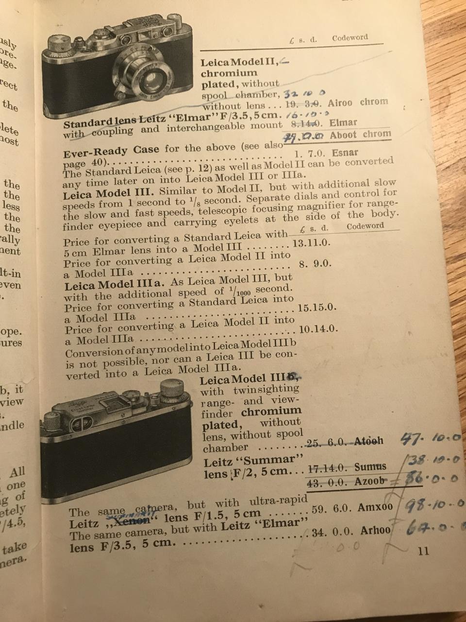 Here is a copy of a page from the 1938 Leica Catalogue coming from a dealer in Dublin and altered by hand to reflect prices increases and new models which were available around 1949. For example, IIIb becomes IIIc, but the model change does not really account for the huge increases in price. In 1939 a IIIb with Summar cost £43, but in 1949 a IIIc with Summar cost £86, an increase of 100%. This cannot be just explained by the change in model from 'b' to 'c'. In 1938 a IIIb with Xenon cost £59-6-0 and in 1949 an equivalent IIIc with Summarit cost £98-10-0. The war had obviously caused inflation effects and wage increases and material prices and shortages would also have had an impact. The dealer in this case was largely an optician business and I suspect that the supply to Dublin may have been from the Leitz office at 20 Mortimer Street in London. At that time the Irish pound was linked on a one for one basis with Sterling. Any information on British prices in the post war period would be welcomed. There may have some tariff differences by that time. US and European price increases over that period would also be interesting. William