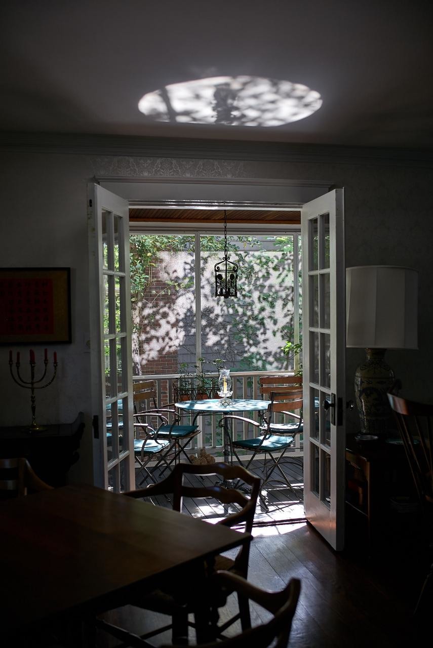 I had to run and get my camera this morning when I saw the way the sunlight played on the porch and into the house. The light on the ceiling is a reflection from the glass table and the spill on the floor is natural. The shading and variety of sun-illuminated surfaces took my breath away. The M(240) with 35 'lux fle do a pretty good job of capturing the magic. Capturing magic might as well be Leica's anthem.
