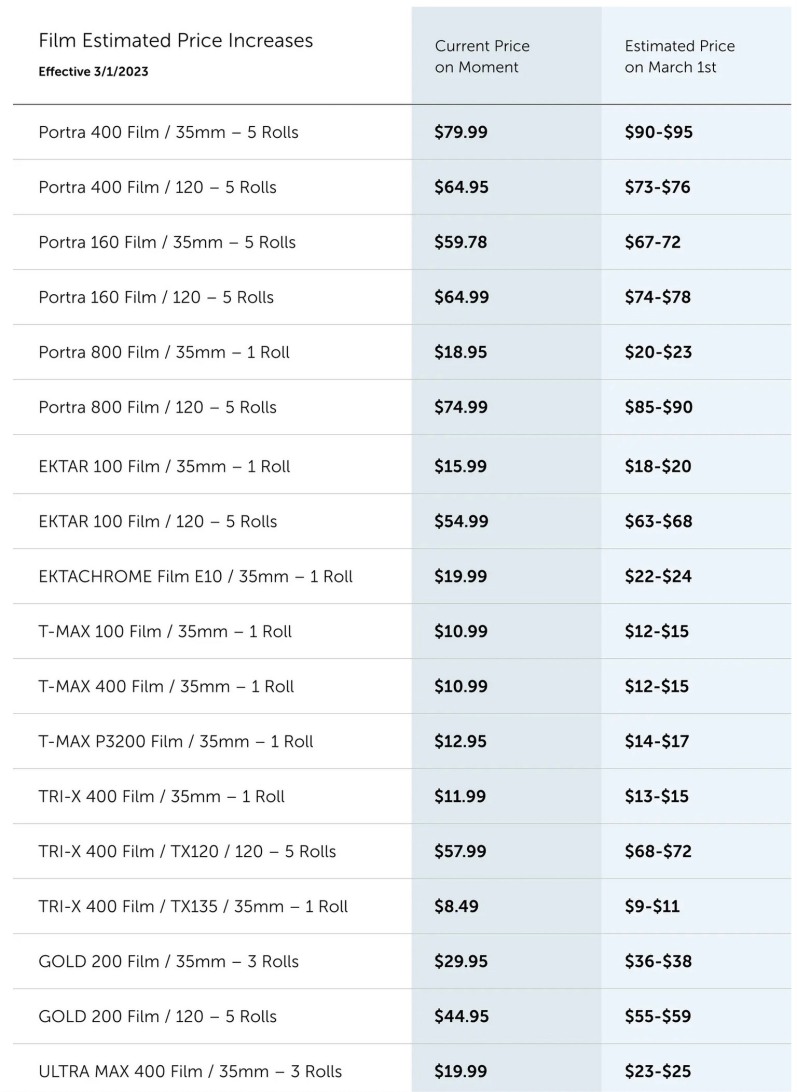 saw this today, quite a substantial price increase... https://www.shopmoment.com/reviews/why-kodak-film-prices-are-increasing-whats-changing-what-isnt https://kosmofoto.com/2022/12/new-kodak-alaris-price-rises-announced-for-march-2023/ """"The price rises from Kodak Alaris – the company which sells photographic film made by Eastman Kodak – come amid continuing supply problems for Kodak-branded films, as the US giant has struggled to meet continuing demand, especially for colour films, amid a global pandemic. The pandemic was largely blamed for earlier rises announced over the past three years. However, this latest price rise seems to be partly due to recent Eastman Kodak’s investment in film production. In October, Eastman Kodak said it wanted to hire more people for its film production division as demand for film continues to soar. Nagraj Bokinkere, Eastman Kodak’s vice-president of film manufacturing, made the plea while appearing on the Get Real podcast for Great Rochester Enterprise, a business hub in the New York-state city where the film producer is based. He said the film maker had already taken on more than 300 new employees over the previous 18 months. In addition, Kosmo Foto has learned that Eastman Kodak has also been upgrading finishing equipment, which has been a stumbling block for increasing production to meet demand"""