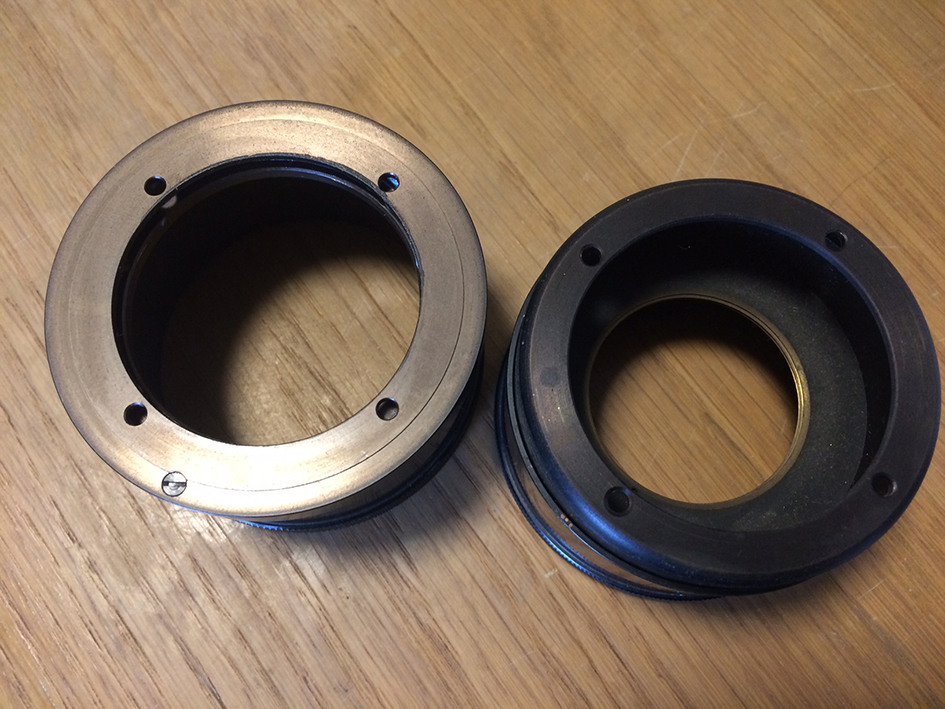 Hello! I have been a fan of the Valoy II enlarger for a long time and I recently found the later grey version which came with an unusual (to me) focus ring. Or perhaps you'd call that the helical? It is the large round holder for the lens. Over twenty Valoy II's must have passed through my hands, but I have never seen this focusing ring. Normally we use an extension ring called DOORX or 17675 to bring down the lens by 15mm. The Focomat Ic has these rings and they're essential for the automatic focus. The Valoy II is much more simple, does not have automatic focus. But the extension ring is still important as it makes the lens more accessible. This focus ring has a different design: - it has the same diameter, but it is not as long as the original - inside there's a M39 threaded ring fixed with 3 black screws, which has the function of the DOORX extension ring - the knurled ring at the bottom is wider The attached images should explain better than my poor English. What it comes down to is both focusing rings do the same, even though the designs inside are very different. When I put them next to each other with the DOORX ring and a Focotar they line up at the bottom and the top . . . Has anyone ever seen this unusual ring, or does anyone know anything about it? I wonder if it was made by Leitz. I looks like it in a more modern sense. Perhaps near the end of the production? The improvements would be 1) no more separate extension rings, 2) easier access to the lens and 3) the wider knurled ring . . . Thanks, Michael ps more pictures in a second post ps 2 in the last picture the original ring on the right looks smaller, but that is because it moved backwards . . .