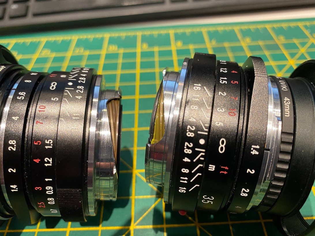 Hi all, I have two identical Voigtlander Nokton 1.4 MC II lenses - the one on the right appears to have more grease than on the left, in fact, I can't see much grease on the left. The one on the right is also much stiffer to rotate. The one on the left is much easier to rotate, as I prefer it, but if you focus to the infinity hard stop, and slowly back off, there is a slight annoying sticking "jump", missing the focus point, and you have to push focus forwards again towards infinity to regain focus. 1) Please can you comment on the amount of grease on the helicoids on both lenses, does one have too much and the other too little? 2) How do I remedy both the stiffer ring of the right, and the sticky ring of the left? Thanks