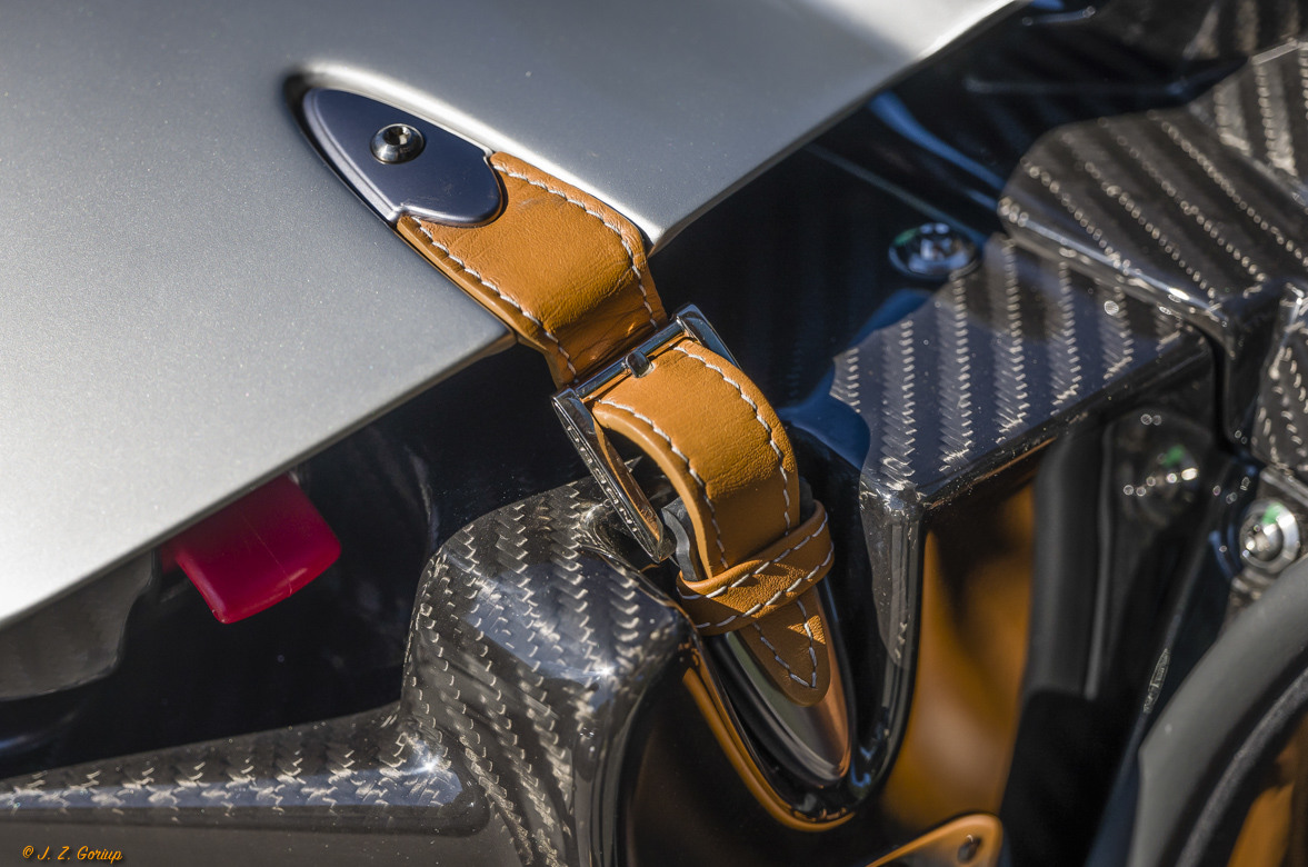 That is one of two old-style, manual leather strap latches which help secure the rear section of the Huayra to keep it from lifting at high speed. Personally, I doubt very much that these straps serve any functional purpose, but the kind of folks who spend US $ 2.6 million on such a conveyance demand and expect that the car tells the world all about their wealth and imagined importance, and Pagani is a master of catering to this type of clientele.....witness the Italian colors on the front-fender mounted mirrors for example, etc. etc.