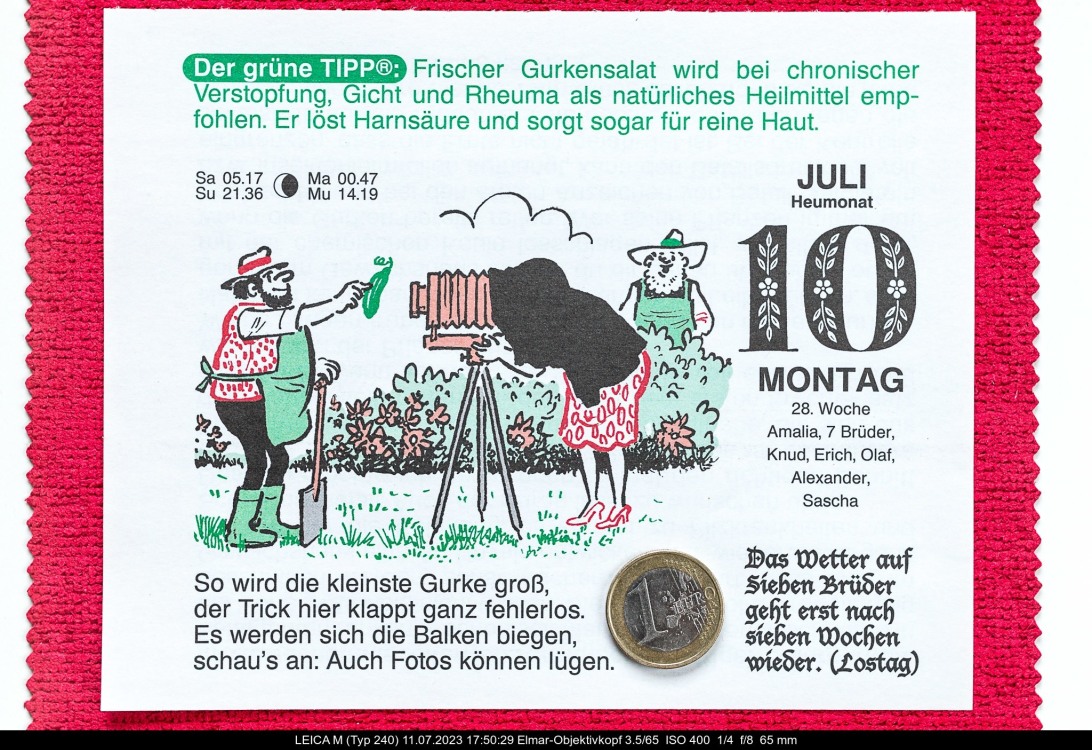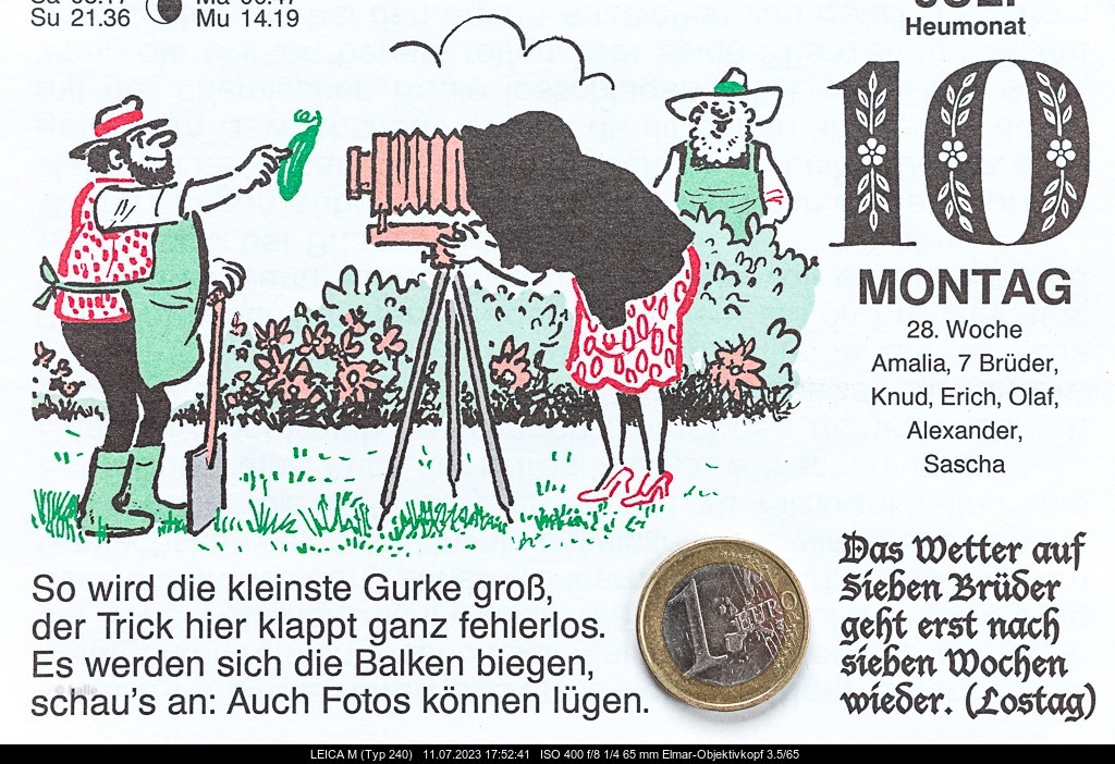 kalle Posted January 21, 2023 Author Share #19 Posted January 21, 2023 Kalenderblätter enthalten mehr oder weniger geistreiche Ergüsse zu Diesem und Jenem. Im Gärtner-Pötschke-Kalender ist zum heutigen 21. Januar nachfolgendes Gedicht von Eugen Roth abgedruckt, das sich lohnt, verwahrt zu werden. Und was liegt da näher, als davon eine Reproduktion anzufertigen?! Welcome, dear visitor! As registered member you'd see an image here… Simply register for free here – We are always happy to welcome new members! Repro eines Kalenderblatts mit SOMKY u. Summicron-Objektivkopf Bei Repros sollte man - auch wegen der vielleicht etwas mangelnden Planlage - auf mindestens f5,6 abblenden. Das Summicron 2/50 (von 1956!) macht einen guten Job (keine Verzeichnung, scharf...), aber besagtes Kalenderblatt ist lediglich 16,5 cm x 13,5 cm groß. Durch die doch zu geringe Naheinstellungsmöglichkeit von Nah-Summicron und "SOMKY-SUM" bleibt da viel an unnötigem "Beiwerk". Freistellen wäre angebracht, doch das ist mir zu "dünn"! Um einem meiner Leitsprüche treu zu bleiben: "Dem Amateur* ist nichts zu schwör!" muss ich mir etwas anderes einfallen lassen: Das Minolta MC Macro Rokkor-QF 3.5/50 lässt sich mit seiner Einstellschnecke ohne Zwischenring bis auf einen Maßstab 1 : 2 (halbe natürliche Größe, bezogen auf das Kleinbild-Format 24 x 36 mm) einstellen. Der Adapter Leitz 22232 (für Minolta an Leica M) ist in meinem Besitz 😄. Da meine Leica M über Liveview verfügt, wäre ein Versuch mit einem Spiegelreflex-Macro-Objektiv es wert, damit ausprobiert zu werden! Hier das Ergebnis: Hat gepasst! _____ * Fotografen, die wie ich aus "Spaß an der Freud" fotografieren, wurden - wenigstens früher - Amateur-Fotografen oder Fotoamateure genannt. -)) 4 Link to post Share on other sites Simply register for free here – We are always happy to welcome new members! Repro eines Kalenderblatts mit SOMKY u. Summicron-Objektivkopf Bei Repros sollte man - auch wegen der vielleicht etwas mangelnden Planlage - auf mindestens f5,6 abblenden. Das Summicron 2/50 (von 1956!) macht einen guten Job (keine Verzeichnung, scharf...), aber besagtes Kalenderblatt ist lediglich 16,5 cm x 13,5 cm groß. Durch die doch zu geringe Naheinstellungsmöglichkeit von Nah-Summicron und "SOMKY-SUM" bleibt da viel an unnötigem "Beiwerk". Freistellen wäre angebracht, doch das ist mir zu "dünn"! Um einem meiner Leitsprüche treu zu bleiben: "Dem Amateur* ist nichts zu schwör!" muss ich mir etwas anderes einfallen lassen: Das Minolta MC Macro Rokkor-QF 3.5/50 lässt sich mit seiner Einstellschnecke ohne Zwischenring bis auf einen Maßstab 1 : 2 (halbe natürliche Größe, bezogen auf das Kleinbild-Format 24 x 36 mm) einstellen. Der Adapter Leitz 22232 (für Minolta an Leica M) ist in meinem Besitz 😄. Da meine Leica M über Liveview verfügt, wäre ein Versuch mit einem Spiegelreflex-Macro-Objektiv es wert, damit ausprobiert zu werden! Hier das Ergebnis: Hat gepasst! _____ * Fotografen, die wie ich aus "Spaß an der Freud" fotografieren, wurden - wenigstens früher - Amateur-Fotografen oder Fotoamateure genannt. -)) ' data-webShareUrl='https://www.l-camera-forum.com/topic/271512-historische-fototechniken-mein-neuer-fast-fertiger-blog/?do=findComment&comment=4652927'>More sharing options...