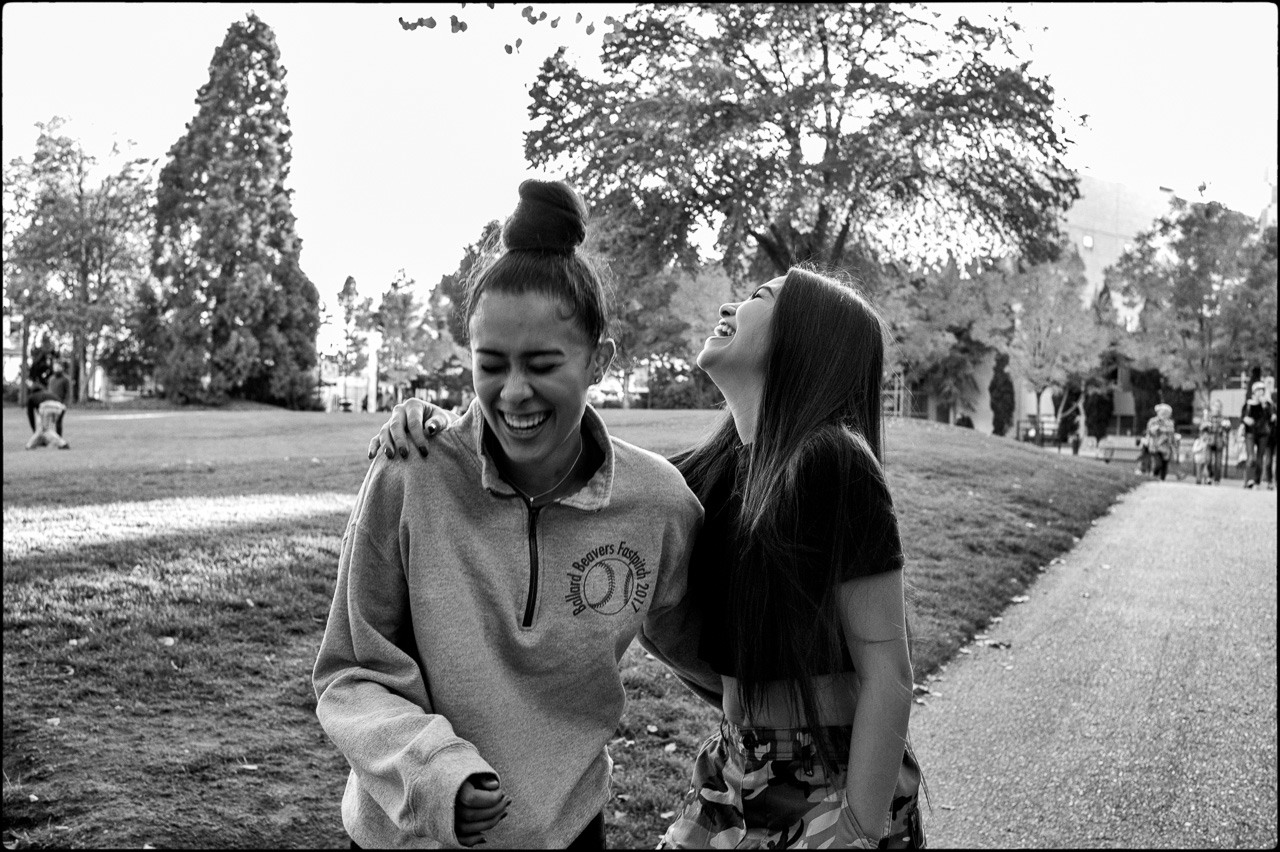 That's one of many things I love about "Henri."  Before motor winders or drives, great eye-finger coordination along with good anticipation and knowledge of shutter lag were much more important.  I seldom put a camera on continuous mode, still preferring to make one frame at a time.  I ran into these young women a couple of years ago in Seattle.  I stopped them, talked a little and asked if I could take their picture.  They were posing, which is not what I wanted, so I starting asking them about themselves but they remained rather posed.  So, being Seattle and looking at the sweatshirt, I asked them if they were lovers.  They both loudly said, "NO!" and started cracking up.  That's when I released the shutter on what I wanted.