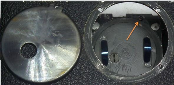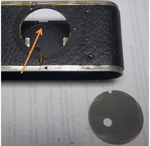 Man sieht den rechteckigen Ausschnitt im Gehäuse, Loch in der Andruckplatte (wozu es ist das wissen alle glaube ich). In der Gehäuse ist ein Stift eingeschlagen, so dass sich die Andruckplatte nicht verdreht. Bei den IAs die ich gesehen habe ist aber der Stift fast mittig vom Ausschnitt, zu sehen auf dem 2-ten Foto