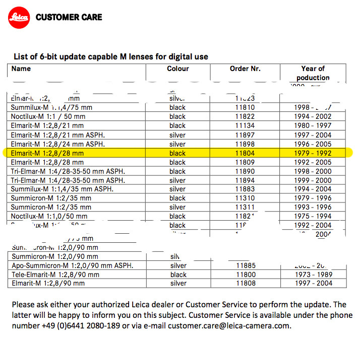 adan Posted July 11, 2019 Share #5  Posted July 11, 2019 Lest there be confusion, the 28mm v.3 (11804) has normally been supported by Leica for 6-bit coding. (Unlike the 35 lux non-ASPH, which never had the modern thin flange required) Doesn't require special machining - simply swapping in a current mount/flange and painting the B/W pits as needed. Welcome, dear visitor! As registered member you'd see an image here… Simply register for free here – We are always happy to welcome new members! But..... - the generous interpretation - Leica can't repair the separated element, and doesn't want to even touch the lens with a screw-driver lest they be held reponsible. - the less generous version - Leica regrets that commitment they made back in 2006, and is looking for any excuse to drive older-lens users to buy new APO/ASPH goodies, and cut back on the service/support they need to maintain for 40-year-old lenses (or even newer R lenses, to jaap's point). I can test that theory - I have an uncoded 75 Summilux (also listed as supported) that, while working fine, would benefit from a CLA as well (focus ring is just microscopically wiggly). I'll send that in, and if I get the "sorry, no parts" excuse on that also, I'll know what they're really up to. But thanks for the DAG tip. Will use if needed in either case. Link to post Share on other sites Simply register for free here – We are always happy to welcome new members! But..... - the generous interpretation - Leica can't repair the separated element, and doesn't want to even touch the lens with a screw-driver lest they be held reponsible. - the less generous version - Leica regrets that commitment they made back in 2006, and is looking for any excuse to drive older-lens users to buy new APO/ASPH goodies, and cut back on the service/support they need to maintain for 40-year-old lenses (or even newer R lenses, to jaap's point). I can test that theory - I have an uncoded 75 Summilux (also listed as supported) that, while working fine, would benefit from a CLA as well (focus ring is just microscopically wiggly). I'll send that in, and if I get the "sorry, no parts" excuse on that also, I'll know what they're really up to. But thanks for the DAG tip. Will use if needed in either case. ' data-webShareUrl='https://www.l-camera-forum.com/topic/298942-here-we-go-again/?do=findComment&comment=3776432'>More sharing options...