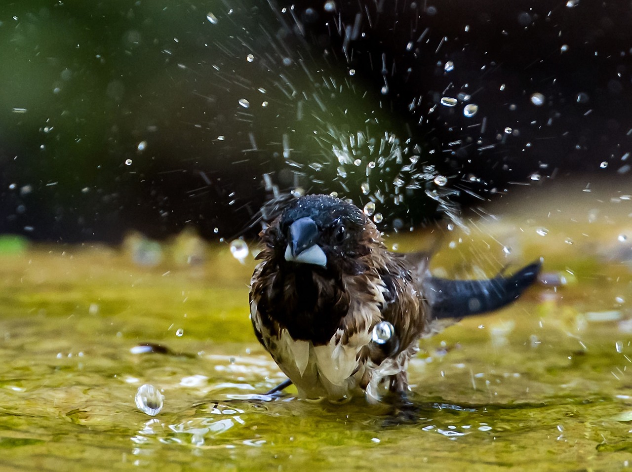 Bronze Mannikin in the rain.  About 7cm tall and weighs approx. 10 grams  -Zuka Game Reserve, South Africa.