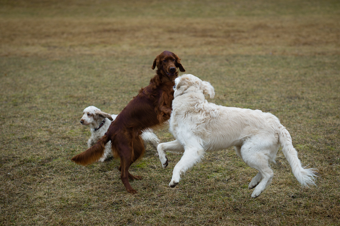 Now I´m really surprised... Dogs are a frequent subject for me, whole flocks of them romping around unleashed on a large field.  And, just for that, I feel that everything BUT an M Leica (M9 in my case) is useless! I don´t need AF, but I do need a camera that exposes exactly when needed!  So, M9 rules the canines... This one is with the 75/2 Apo.  And, those 3 guys didn´t wait for me...