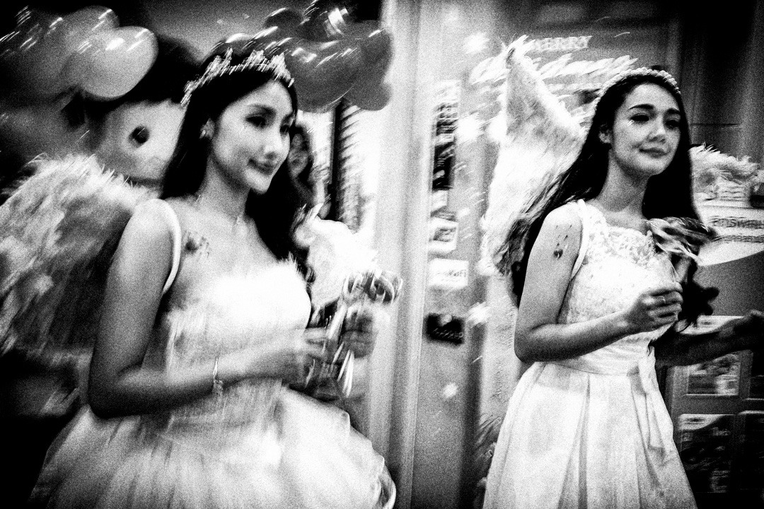 gtownby Posted January 22, 2021 Author Share #14 Posted January 22, 2021 12 hours ago, Nowhereman said: Not film but with the M10: everything that I like in the photo below was an accident. I was trying out the Nikon Z7 at a camera store in Chiang Mai,. While I was looking at the Nikon, the two salesmen asked to look at my Leica M10. When I saw this little Valentine's Day procession walking by — never mind that there's a sign for Christmas in the background — I quickly asked for the camera. I didn't know that they had changed the settings; so that when I used the meter to set the shutter speed (when the LEDs lined up in the viewfinder), I didn't realize that I had set the shutter speed as slow as 1/45 sec — there was no time to check, as they would have walked past me. It was lucky that the aperture was at f/11, or nothing would have been in focus. M10 | Summicron 35v4 | ISO 3200 | f/11 | 1/45 sec Welcome, dear visitor! As registered member you'd see an image here… Simply register for free here – We are always happy to welcome new members! ________________________Frog Leaping photobook Mitch - Yes, the accidental movement blur really makes this photo. Link to post Share on other sites More sharing options...