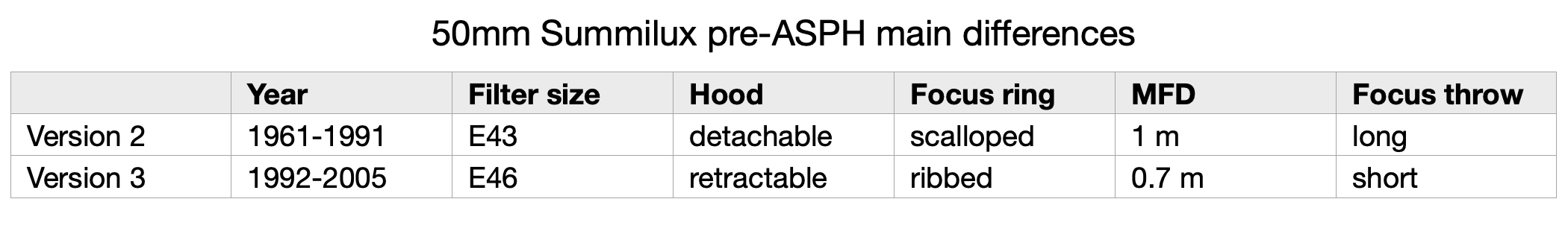 evikne Posted May 28 Author Share #1237 Posted May 28 58 minutes ago, mmanda said: Ok SOLD! 😁 I think I want to buy one of these lenses. I still find all the variants a bit confusing. Is this what I'm after? I hope its ok to post a link to an auction. What exactly does the E46 reference, is it a model number or ? @evikne sorry if you just got like a gazillion notifications, I started at the beginning of this thread was hitting like like like, then realised this poor guy is going to get hit with so many notifications, so I stopped. Love all the images in here. As, @Crem said, the link is to a version 2. E46 stands for the filter size, which is a way of separating v2 from v3. Here is a diagram showing the main differences. Both versions should be optically identical, so the rendering is the same: Welcome, dear visitor! As registered member you'd see an image here… Simply register for free here – We are always happy to welcome new members! Regarding the likes - you can never have too many likes. 😄 Thank you so much! ☺️ But I've mentioned to the forum admin before that there should be an easier way to check your notifications, e.g. by hovering over them and getting a small preview of which post it applies to. 3 Link to post Share on other sites Simply register for free here – We are always happy to welcome new members! Regarding the likes - you can never have too many likes. 😄 Thank you so much! ☺️ But I've mentioned to the forum admin before that there should be an easier way to check your notifications, e.g. by hovering over them and getting a small preview of which post it applies to. ' data-webShareUrl='https://www.l-camera-forum.com/topic/318444-the-50mm-summilux-pre-asph-image-thread/?do=findComment&comment=5808436'>More sharing options...
