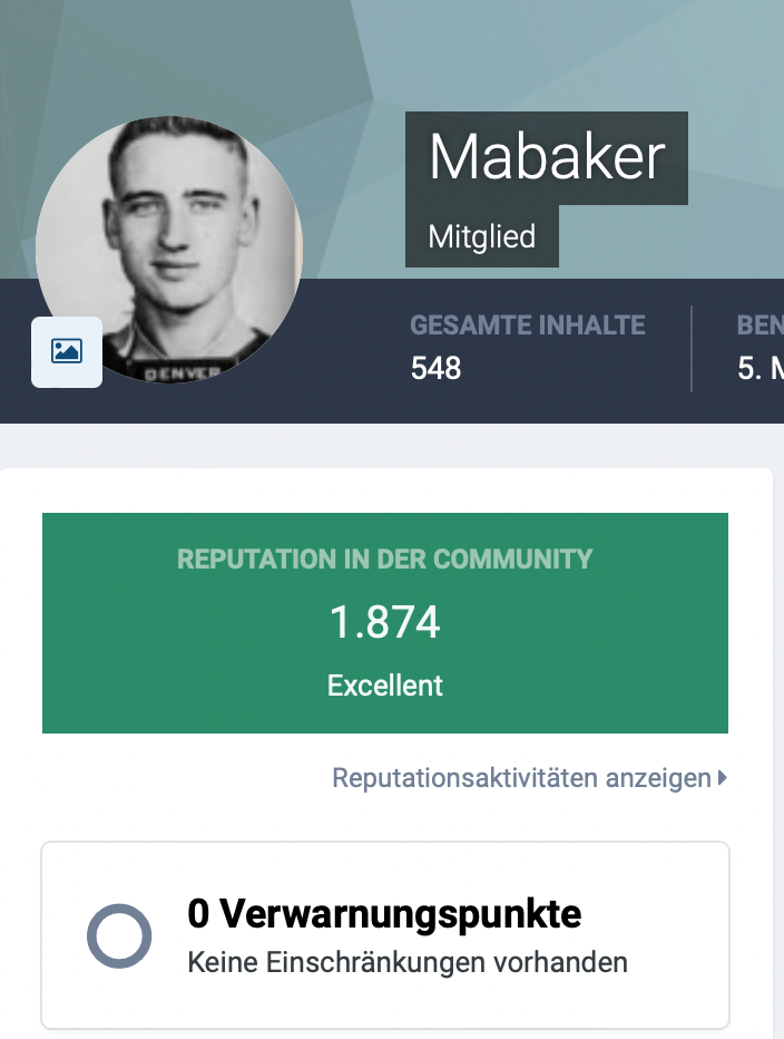 Advertisement Posted November 5, 2021 Posted November 5, 2021 Hi Commander, Take a look here "Allgemeine Reputation des Benutzers".... I'm sure you'll find what you were looking for!