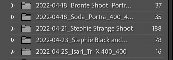 grahamc Posted May 20, 2022 Author Share #45 Posted May 20, 2022 (edited) 11 hours ago, johnwolf said: I name my contact sheet files by date developed in the format YYYYMMDD. I store them in LR folderr for each year, with the folders sorted filename descending so they are ordered last first. I use the same filename on the plastic sheets so it's easy to cross reference. I keep the sheets in a binder with year dividers. Pretty simple. For scanned image filenames, I use the contact sheet filename prefix with negative number suffix; for example 20220429_03. Love to hear what others do.... LR keywords would be good, but I never get around to it. Recently I started opening the contact sheets in Photoshop and typing basic info. Takes a minute but I like the neater look. FWIW, here's an example: Welcome, dear visitor! As registered member you'd see an image here… Simply register for free here – We are always happy to welcome new members! I plan to do similar - My naming convention is the same as yours (either for a folder of a digital shoot or outing) and also for rolls of film back from the lab. For example YYYYMMDD_Bondi Beach Shoot. And then they live under within. folder for that year. The physical negs could just have the same pre-fix, it would be easy enough to find the negs even if there was 3 rolls from the same date 9I wouldn't be bothered to write "Bondi Beach Shoot' on physical the neg storage sheet I'm sure). I could ditch the descriptor and just call them YYYYMMDD_001 and so on but I find having a descriptor in the folder title is handy and they still appear in LR sequentially. As do the photos as as I have a rule set up that imports them with MySurname_YYYYMMDD_sequential image number . I find this works well, the only thing to add is the film stock, dev time, lenses etc etc which I currently do by Keywords but should really integrate something that manipulates the EXIF data so that tis info sits in the correct area eg lens Type, Camera, etc . For now I just note this in the folder name or keywords until I get around to finding an EXIF plug-in that works for me, at which point I plan to tidy it all up. So for now, typically for scanned images my Folder name will include Film Stock and what I rated the roll at (eg YYYYMMDD_Bondi Beach Shoot_Tri-X400_320), and then my key word will note the camera and lens used. Like so (obviously needs tidying up a little to be more consistent but quite easy to find things): I don't see this use of contact sheets would really change anything there would just be a contact sheet in each folder aswell as the images. in some cases if the roll was a dud there may just be a contact sheet. Until such time as I discover in the future that the dud roll was in fact the work of a genius 😂 Edited May 20, 2022 by grahamc Link to post Share on other sites More sharing options...