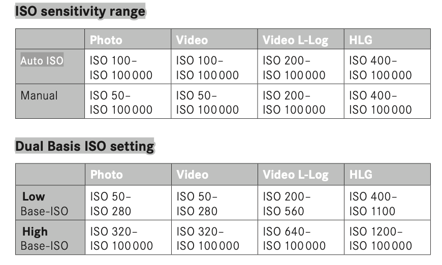 FlashGordonPhotography Posted April 22, 2024 Share #96 Posted April 22, 2024 7 hours ago, SrMi said: That is wrong. Here is Leica's table, p337, from SL3's manual. While Leica claims ISO 50 to be the (first) native ISO, I would avoid it. Welcome, dear visitor! As registered member you'd see an image here… Simply register for free here – We are always happy to welcome new members! Wow. That is ambiguous. Elsewhere Leica have said base ISO is 100 and 50 is a pull. You are absolutely correct to avoid ISO 50. Gordon 1 Link to post Share on other sites More sharing options...