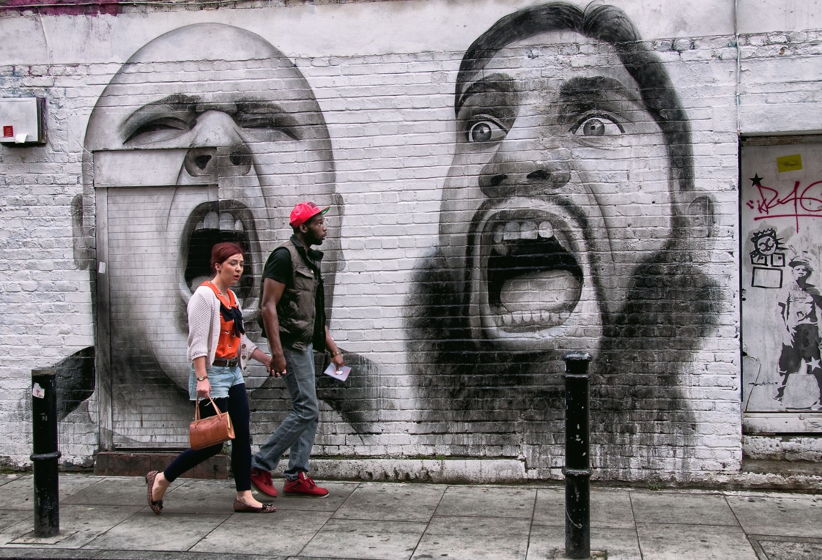 I'm understand the 'beef' about street art but it is part and parcel of a forum such as this and in the main I usually ignore the posts for the same reason. There are plenty of other ‘soft’ options in these-here parts. However, I think that being too prescriptive may have disadvantages. I usually photograph street art on arriving at my day’s location to check the camera settings, get in the zone and so on so that when something I do want presents itself, the mechanical things should work fine. I’ve taken the liberty of attaching one of my first ventures in photography on the street, it was a grab’ shot. The skinhead and the fundamentalist joined in vitriol and the apprehension on the faces of the young couple and so it does have content other than the art.