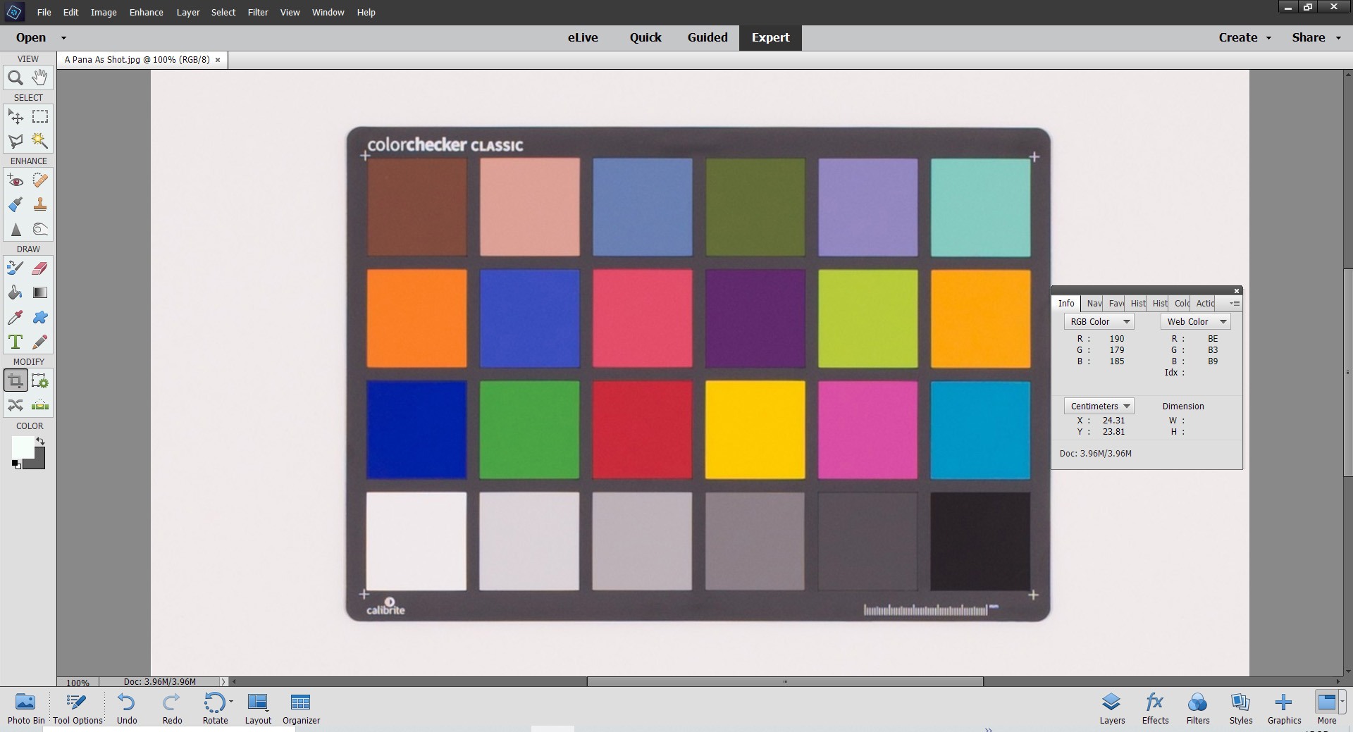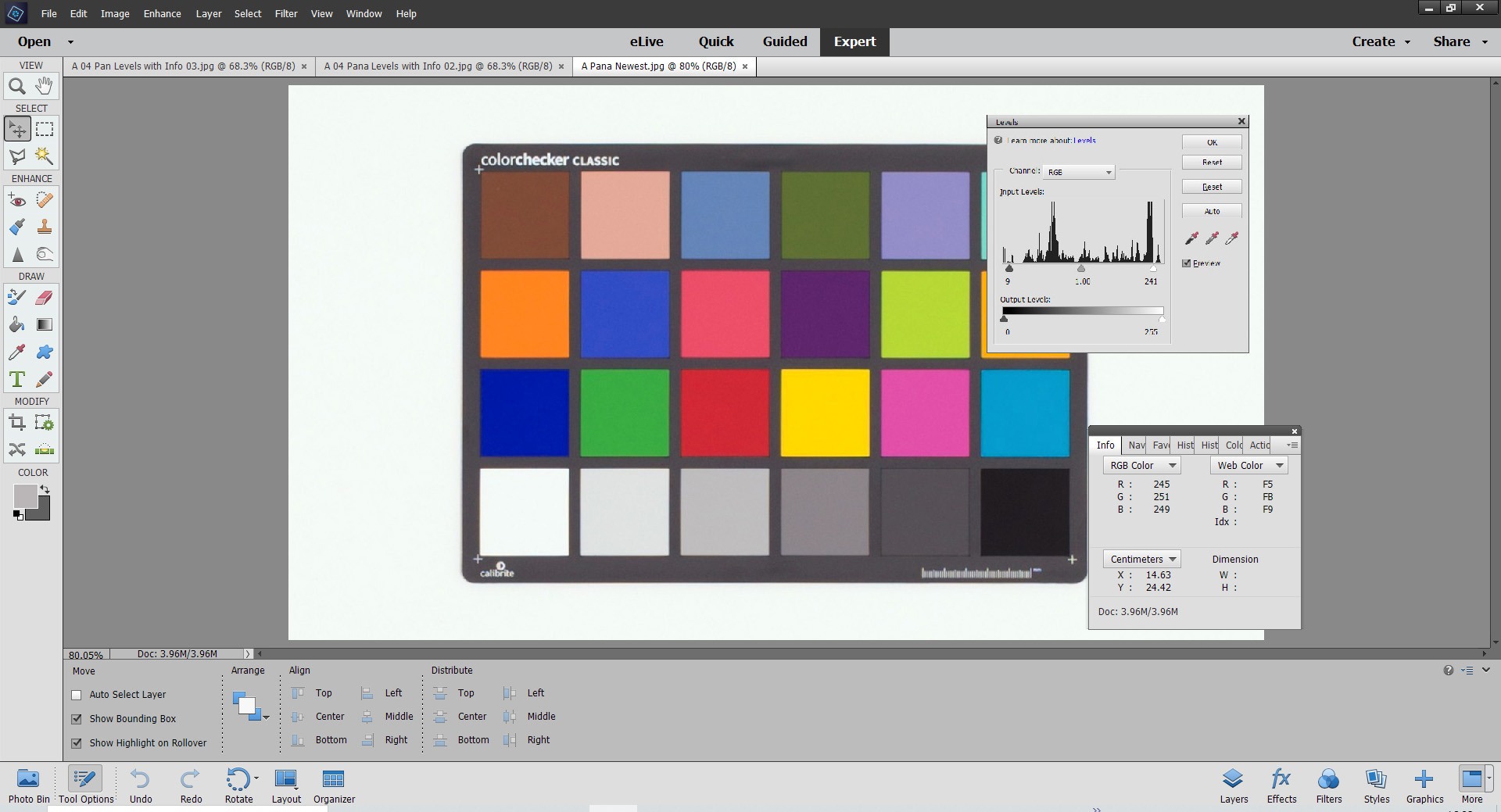 The image, as can be seen, is very flat (hence the 'muddy-looking' white behind the checker) so the next stage is to adjust contrast-levels.We are looking for a neutral near-white somewhere (RGB in the 240's) and a neutral mid-tone (blacks should be well down too).