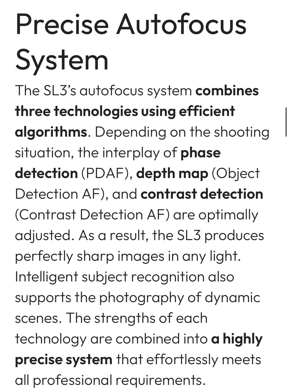 LD_50 Posted January 24 Share #34 Posted January 24 (edited) 1 hour ago, jaapv said: This thread is about the SL3S which has a hybrid AF system - PDAF and CDAF, unlike the SL3. Please explain how a technical specification is marketing and "reality is different" Leica describes the SL3 as also having hybrid AF. From SL3 technical specs page on Leica’s website: Welcome, dear visitor! As registered member you'd see an image here… Simply register for free here – We are always happy to welcome new members! From SL3 marketing narrative on Leica’s website: Edited January 24 by LD_50 Link to post Share on other sites Simply register for free here – We are always happy to welcome new members! From SL3 marketing narrative on Leica’s website: ' data-webShareUrl='https://www.l-camera-forum.com/topic/418707-sl3-s-is-the-af-ability-to-track-subjects-in-busy-scenes-improved/?do=findComment&comment=5745693'>More sharing options...