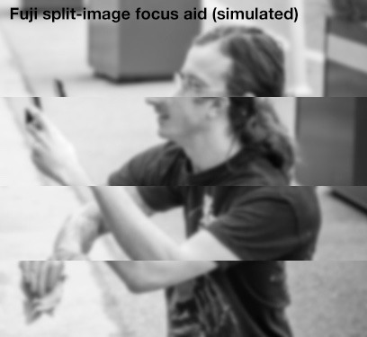 Fuji’s digital split-image focusing works like on an SLR: the sections are all blurry when you’re out of focus, and the amount of shift displayed is based on PDAF info.