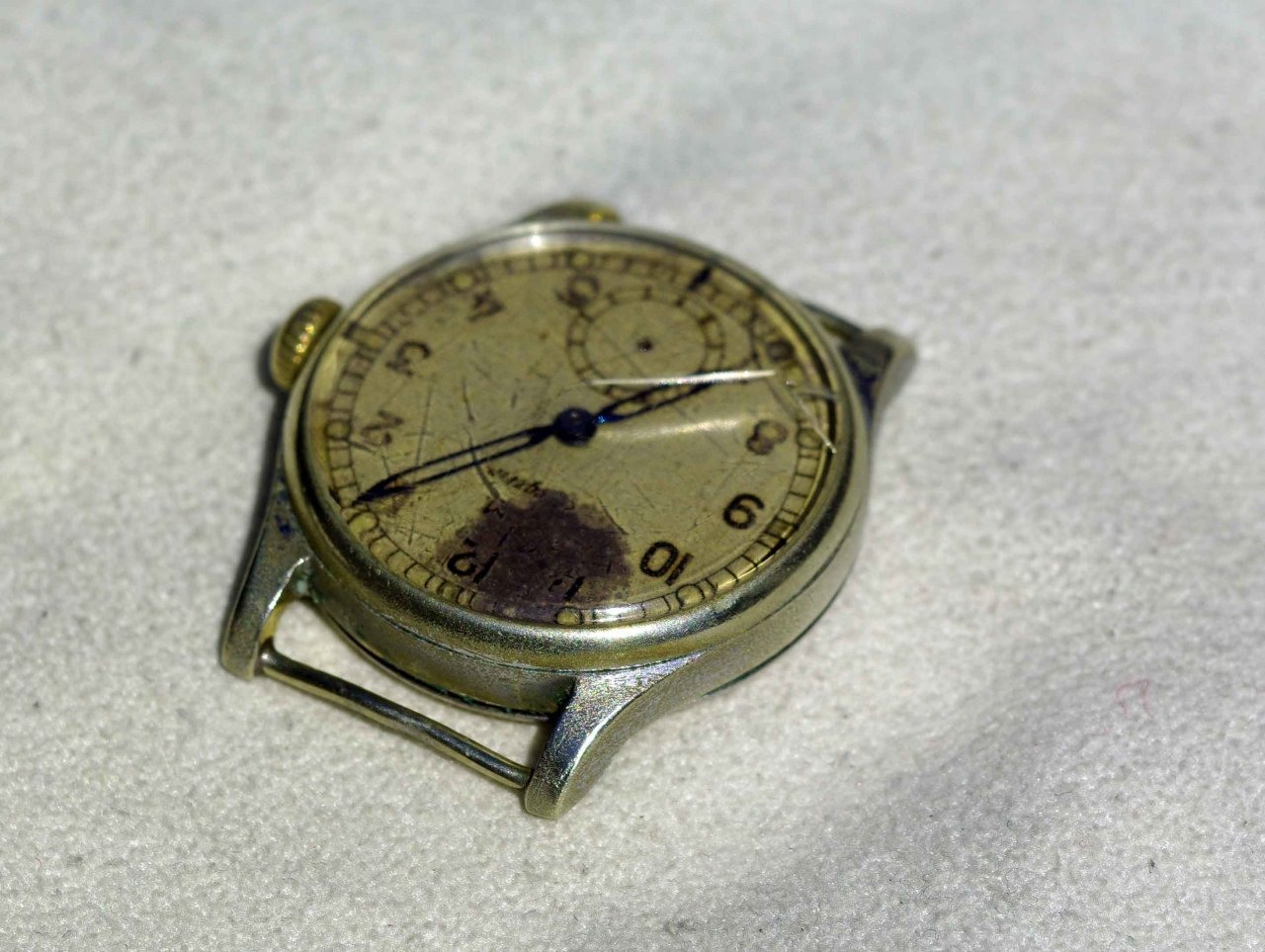 Ich hatte Glück in einer Werkstattauflösung ein kleines Konvolut mit Zifferblättern zu entdecken. Ein kleines Wunder: Ein Originalblatt aus den 30ern. Unverbaut. Von einem zivilen Modell, ohne KM Aufdruck. Sonst identisch. Und so sieht die kleine dann zwei Jahre später überholt und etwas poliert ganz manierlich aus... Läuft ohne nennenswerte Abweichungen.