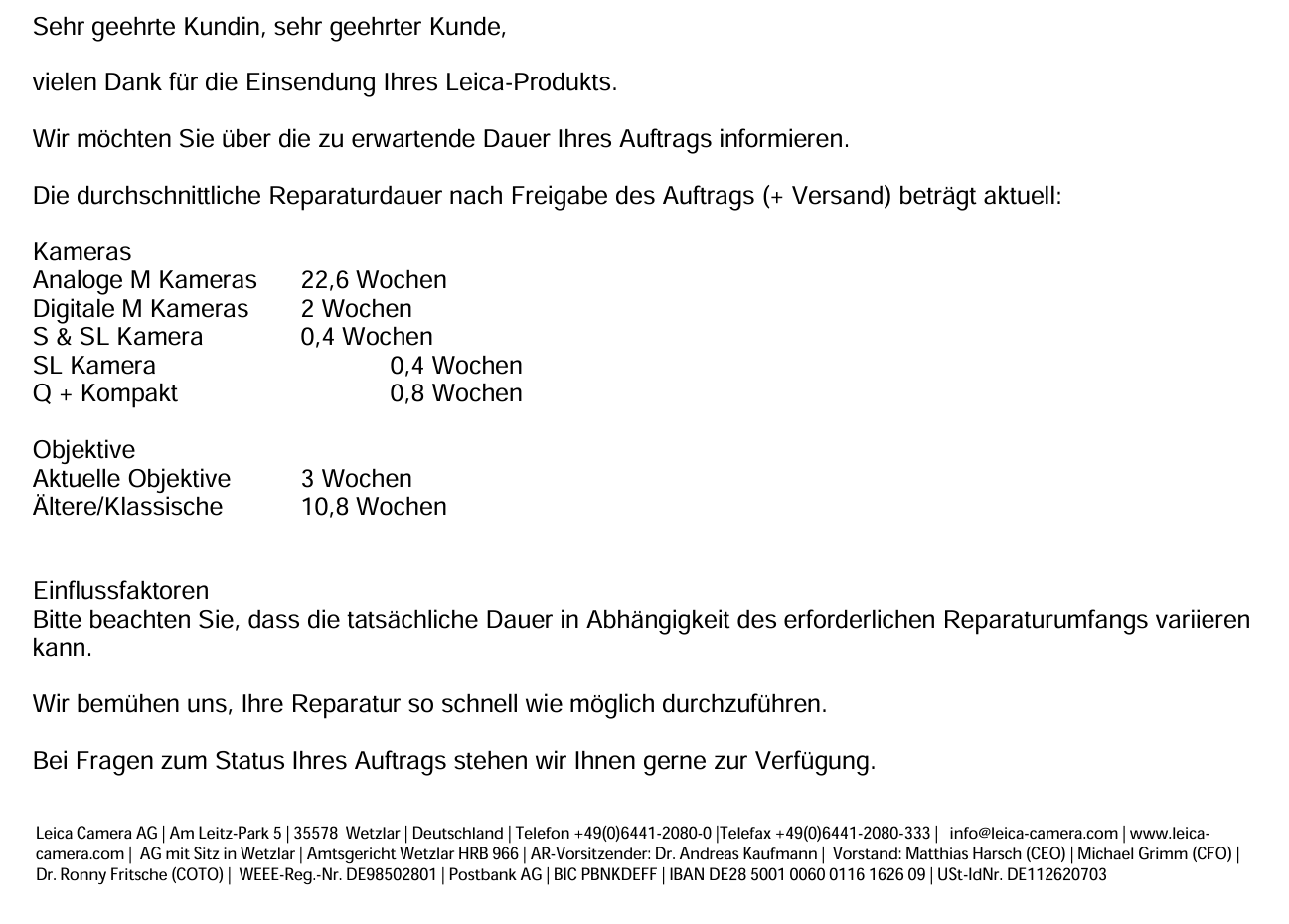 Danke für das Einstellen. Ich finde diese Zeiten absolut in Ordnung. SL und Q unterhalb einer Woche ist doch top. Sehr viel schneller dürften andere Hersteller mit aktuellen Kameras wohl nur bei aufpreispflichtigen Professional-Services sein. Das bei den M-Kameras deckt sich auch mit meiner Erfahrung.